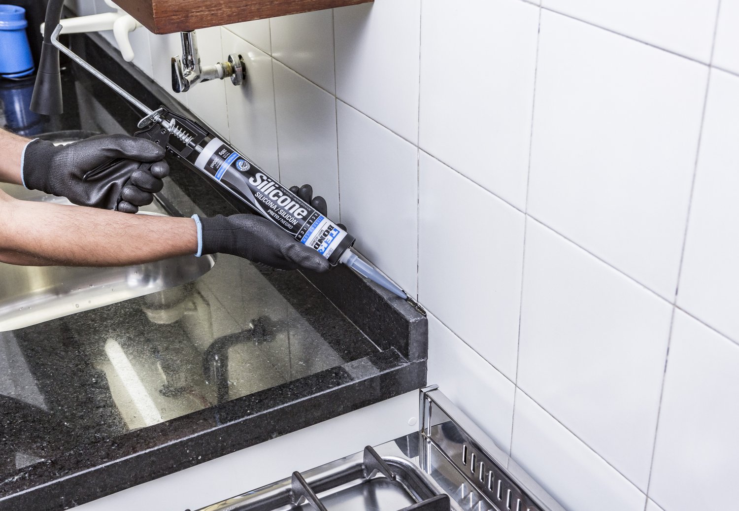 :: Aplicar o silicone na área desejada e fazer o acabamento.