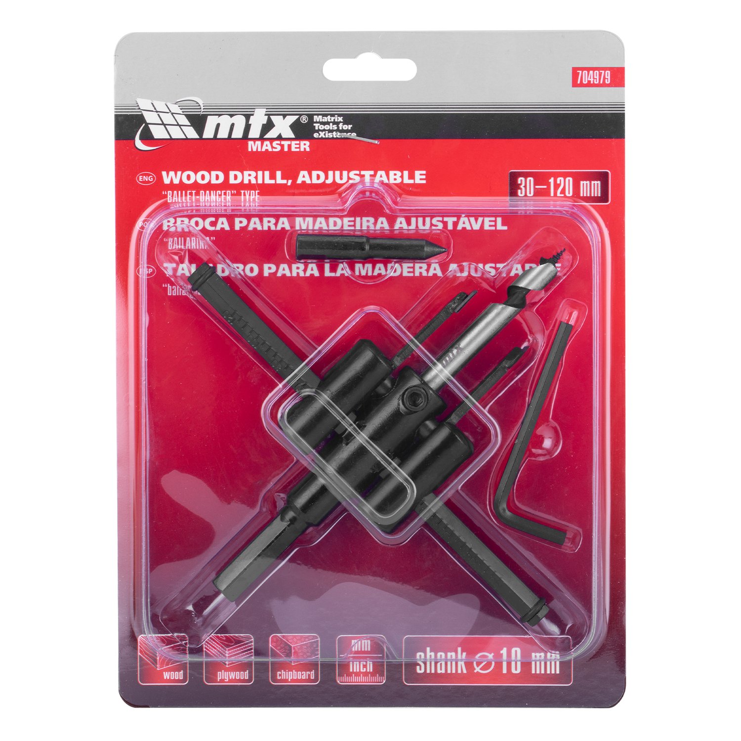 1 Broca Ajustável MTX 30 a 120mm, 1 chave hexagonal, 1 broca guia.