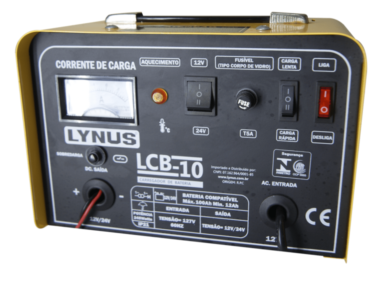 O Carregador de Bateria 12-100Ah 220V LCB-10 Lynus é ideal para carregar todos os tipos de baterias com segurança. Conta com aviso luminoso de superaquecimento e fusível de entrada, oferecendo maior proteção ao usuário. Certificado conforme a Portaria Inmetro nº 148/2022 por ABNT OCP 0005, garante qualidade e confiabilidade.