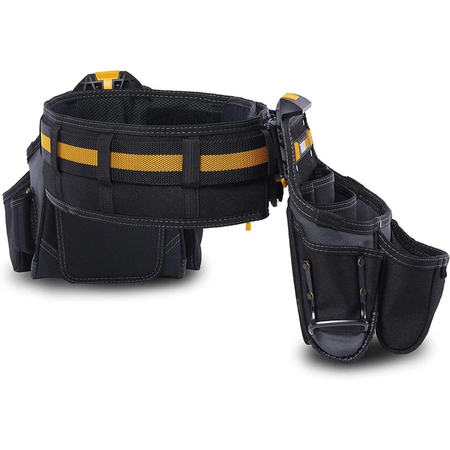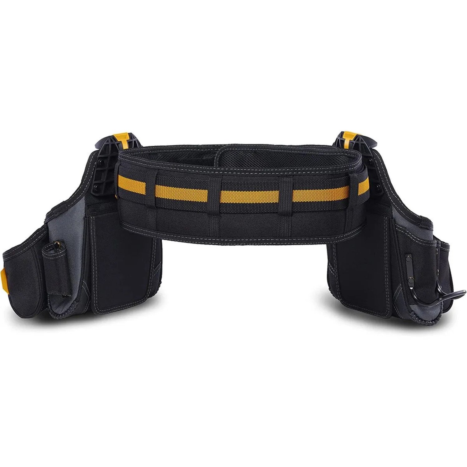 Os porta-ferramentas possuem suporte integrado, garantindo estabilidade em superfícies planas como chão ou mesas. Com 27 bolsos e laços, incluindo 5 de grande capacidade com costura oculta, um bolso para caderno, porta-martelo de metal e 2 clipes para trena, o conjunto oferece ampla organização. Feito com construção reforçada de 6 camadas, rebites premium e uma fivela resistente.
