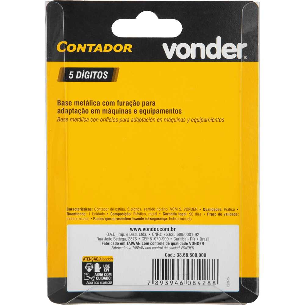 O Contador de Batida Vonder VCM 5 entrega precisão mecânica confiável para operações que exigem controle absoluto de ciclos, volumes e movimentos repetitivos. Construído para uso profissional, ele mantém estabilidade mesmo em máquinas de alta rotação, garantindo leitura clara, operação direta e durabilidade sólida graças à sua estrutura metálica.