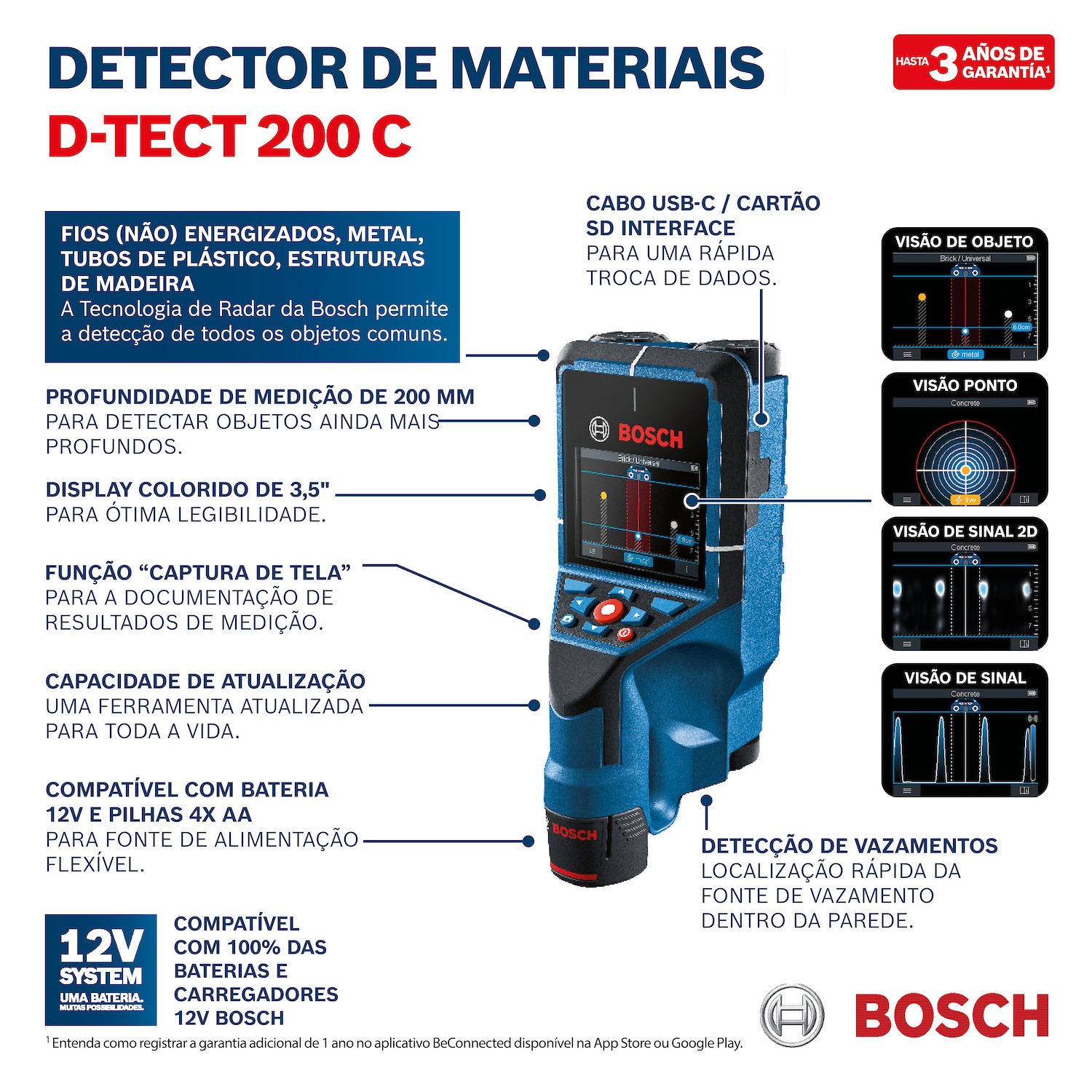 O Detector de Materiais Bosch D-TECT 200 C é ideal para localizar com precisão objetos ocultos em paredes, pisos e tetos. Utilizando tecnologia de radar da Bosch, detecta metais ferrosos e não ferrosos, cabos energizados ou não, tubos plásticos (cheios ou vazios), estruturas de madeira e cavidades, com profundidade de detecção de até 200mm em concreto seco.