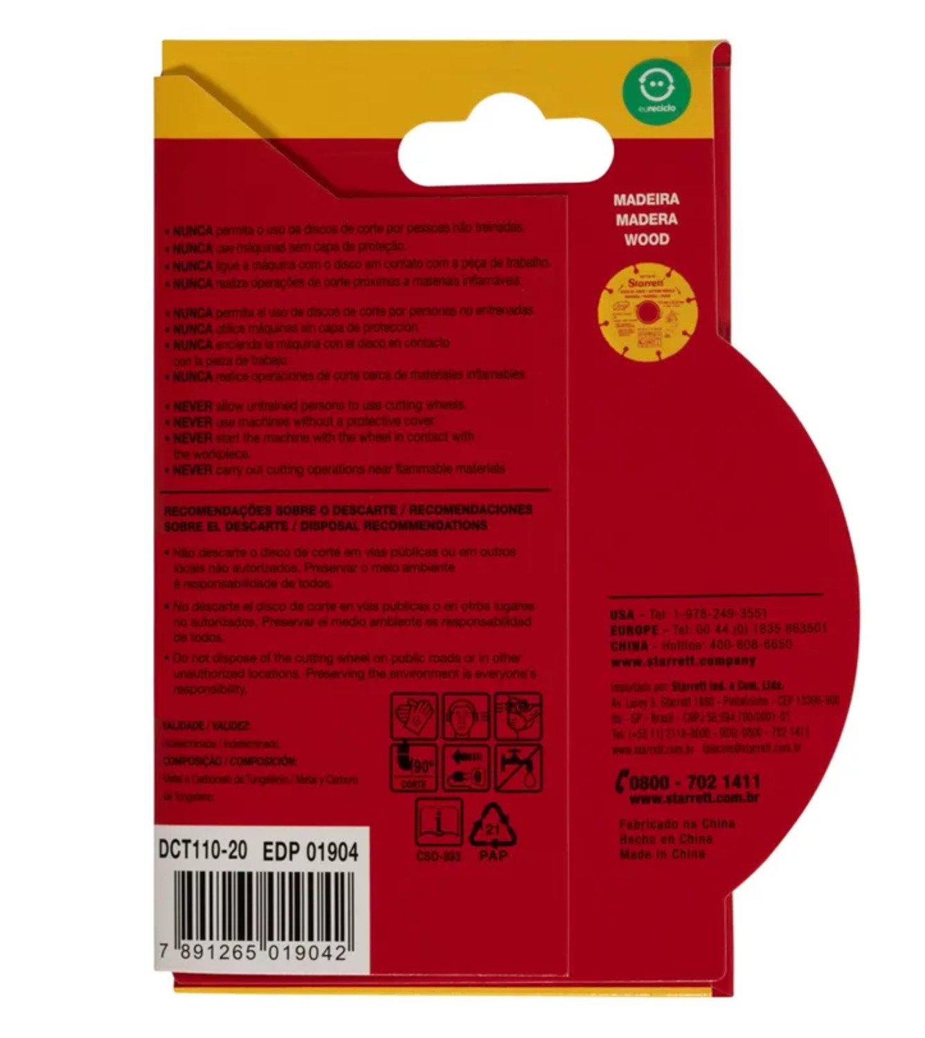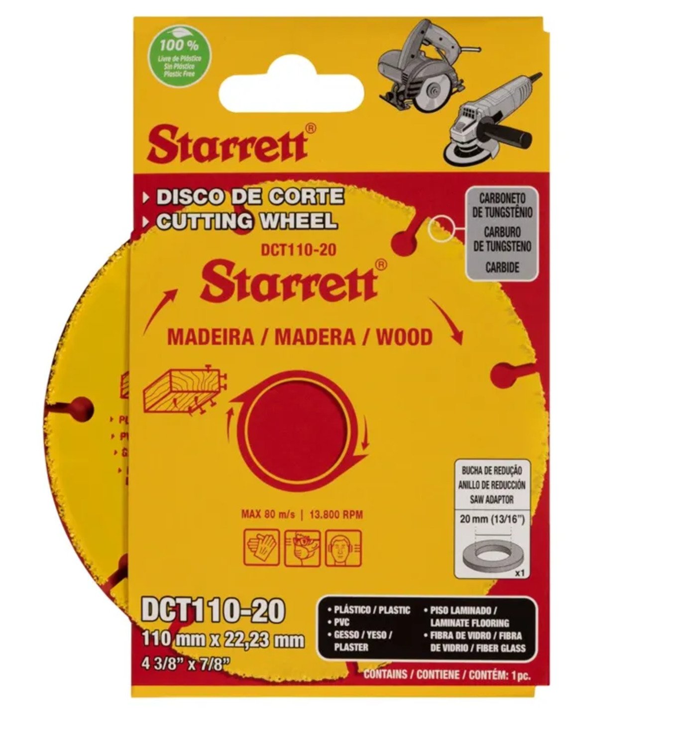 1 Disco de Corte para Madeira 110mm com Tungstênio Starrett DCT110-20.