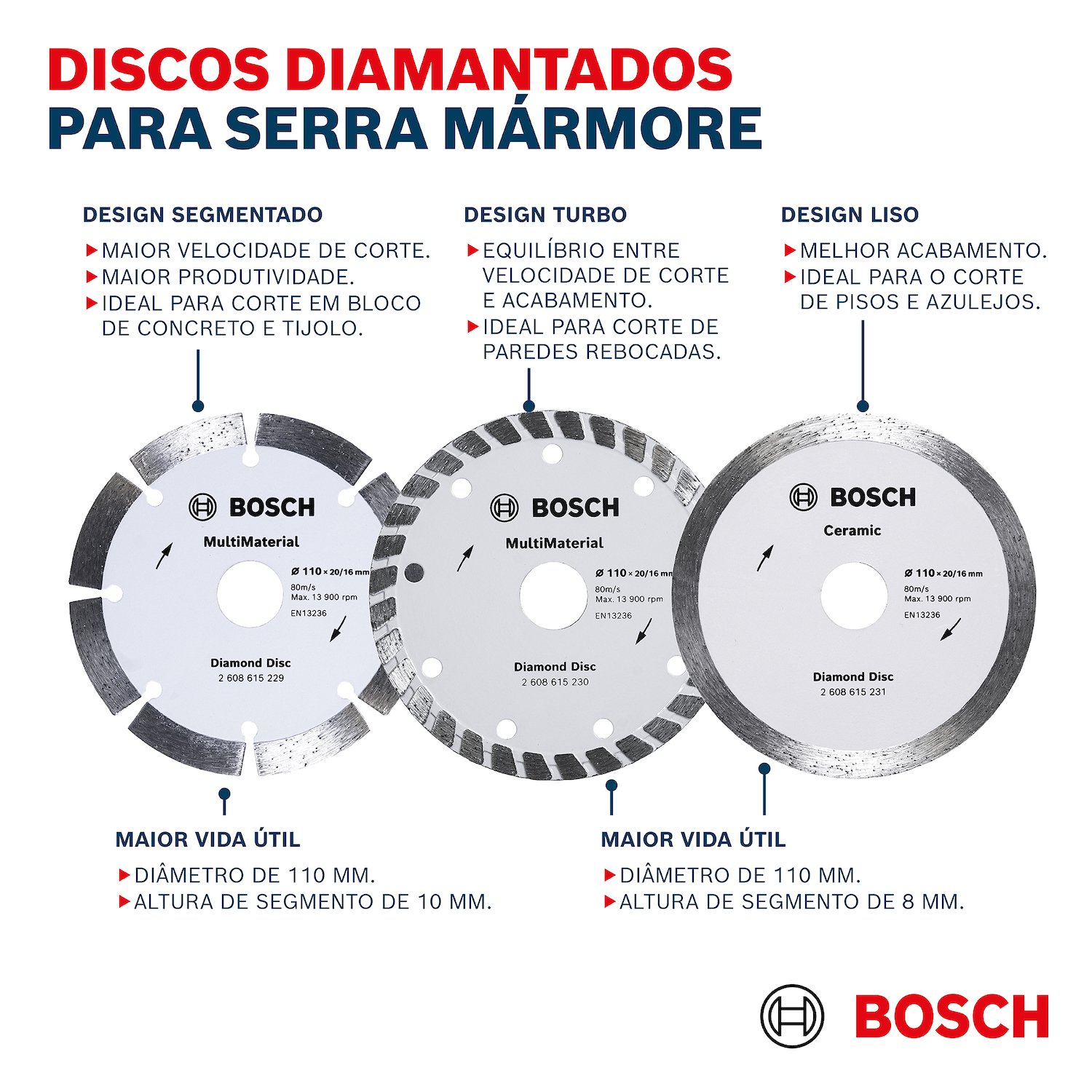 Disco diamantado Bosch, ideal para profissionais da construção civil, instaladores de pisos e revestimentos, pedreiros e outros que buscam desempenho e resistência em cortes diversos.