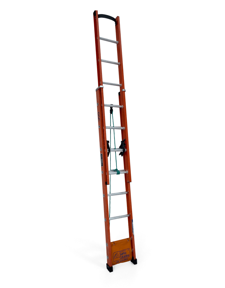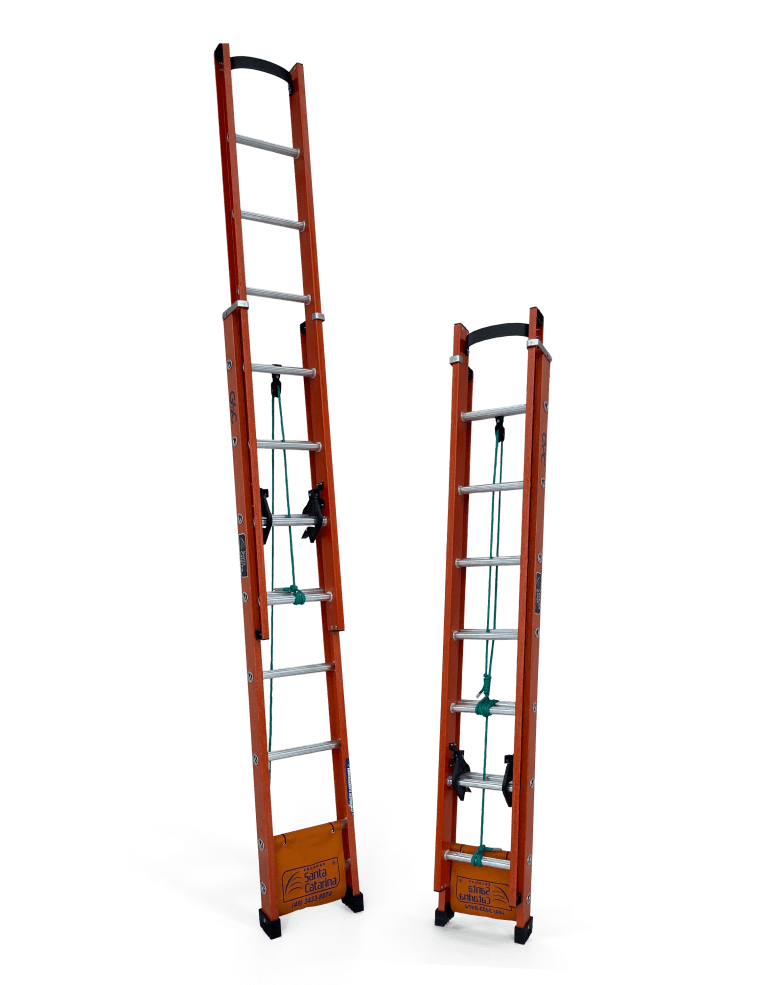 Composta por duas partes, sendo uma fixa e outra extensível içada por corda, a escada conta com catraca de travamento nos degraus, garantindo firmeza e praticidade no uso. Sua estrutura é leve, resistente à corrosão e dispensa manutenção frequente, suportando até 120 kg de carga de trabalho.