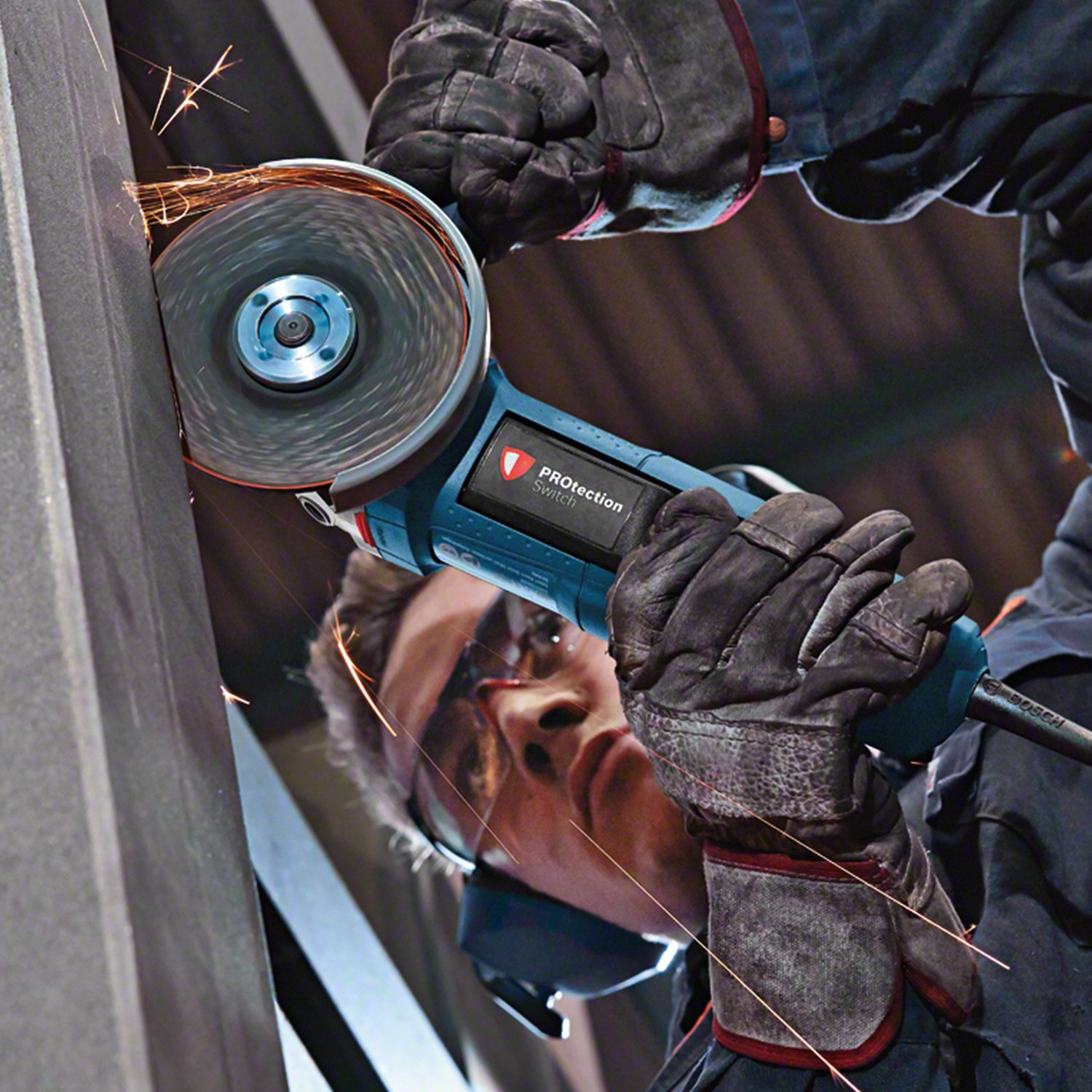 Seu design compacto e empunhadura ergonômica proporcionam maior conforto e controle, especialmente em locais de difícil acesso. O interruptor PROtection (tipo "homem morto") desliga automaticamente a ferramenta ao ser solto, aumentando a segurança durante o uso. A capa de proteção de 125 mm com fixação por parafuso garante estabilidade e proteção ao operador.