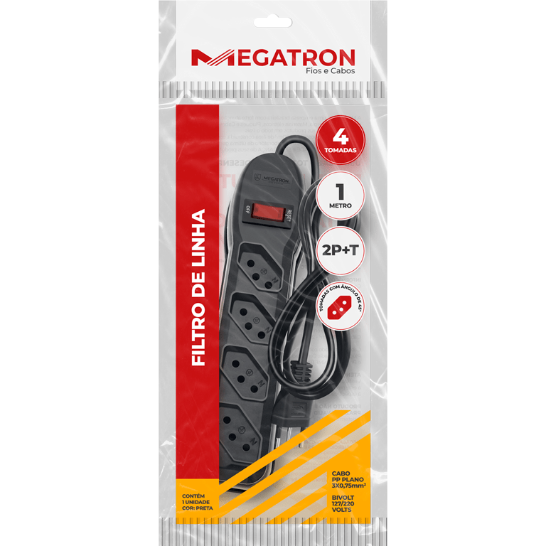 O Filtro de Linha 4 Tomadas 45° 1 Metro Megatron é a escolha ideal pra quem quer praticidade no dia a dia com segurança real pros seus eletrônicos. Com tomadas inclinadas a 45°, ele facilita a conexão de carregadores e fontes maiores, otimizando espaço e evitando aquele emaranhado de cabos.