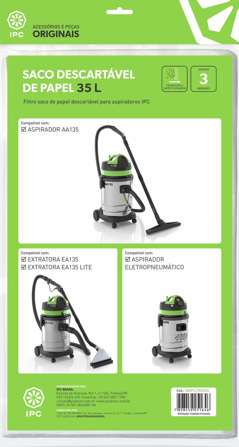 O Filtro Descartável 35L IPC BRASIL com 3 peças modelo SBNFILTROD35L foi desenvolvido para ser usado no aspirador de pó e líquidos modelo A135 também da IPC Soteco, com a finalidade armazenar resíduos aspirados aumentando assim produtividade de limpeza.