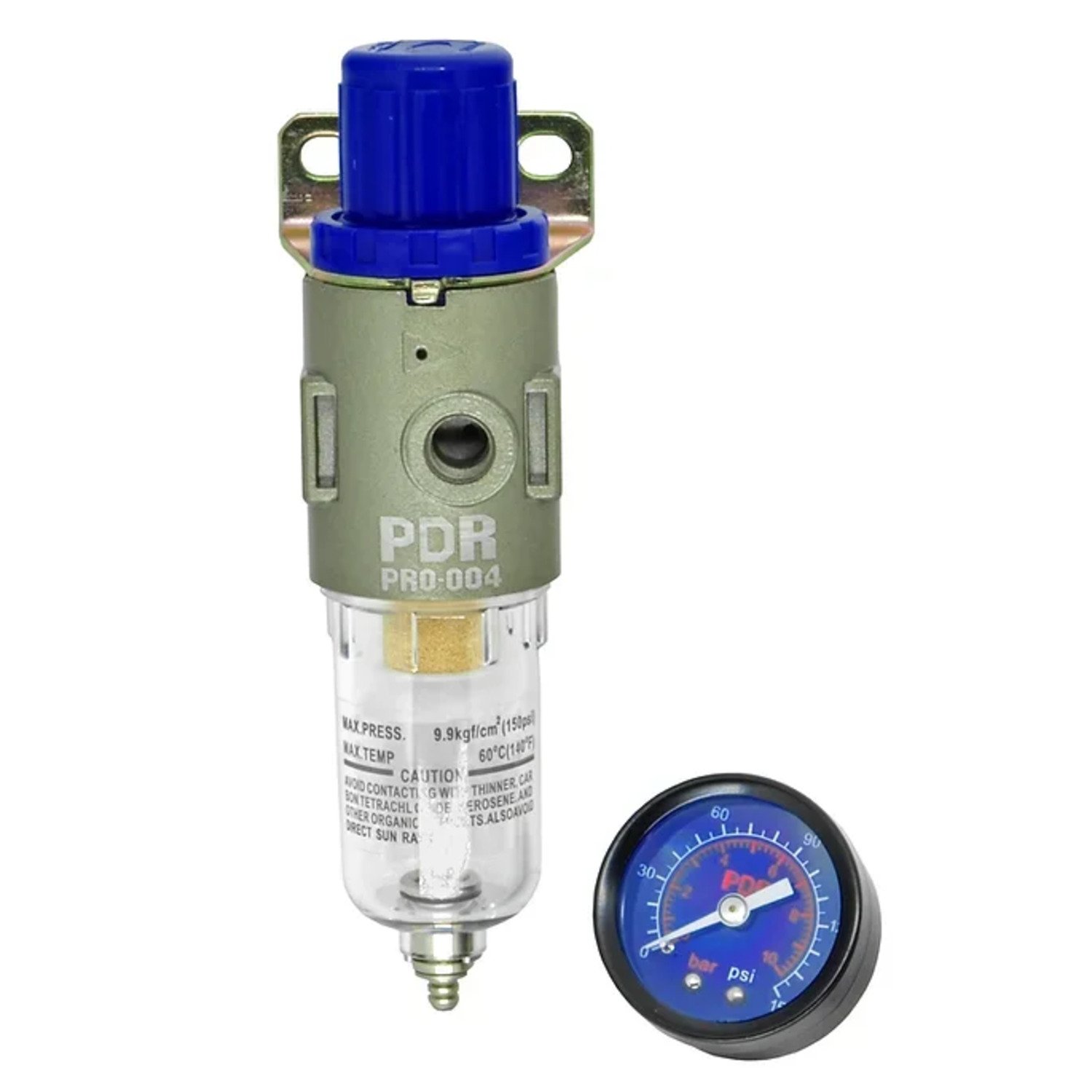 O Filtro Regulador de Ar 1/4" PRO-004 PDR é indicado para melhor funcionamento das ferramentas pneumáticas e aumento da vida útil de seus componentes. Filtrando e regulando a pressão do ar comprimido antes deste chegar à ferramenta.