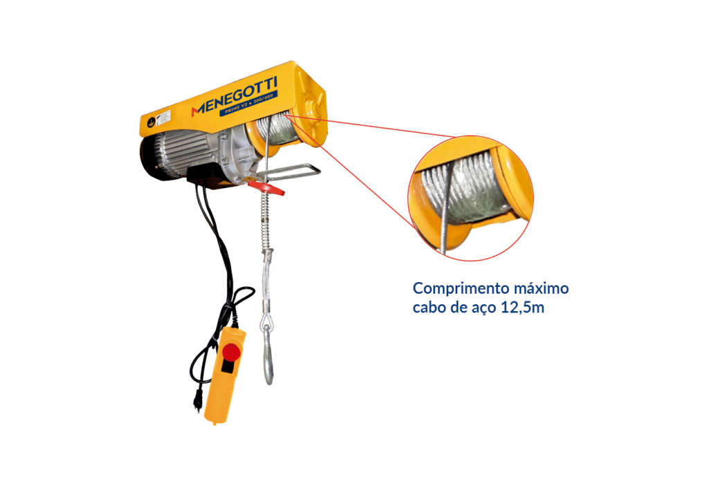 Com motor elétrico de 220V e estrutura reforçada em aço, o Guincho Menegotti 300-600Kg oferece desempenho confiável mesmo em uso contínuo. Seu cabo de aço galvanizado não rotativo (17×7 AF) assegura durabilidade e estabilidade durante a operação. Além disso, conta com sistema de freio automático, fim de curso e chave de emergência, garantindo total segurança em cada movimento.