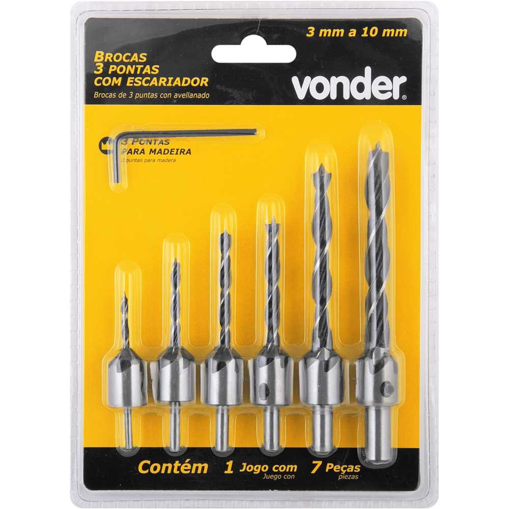 Se você busca um jogo de brocas 3 pontas com escareador que una precisão, praticidade e resistência para trabalhos em madeira, o conjunto da Vonder 3599003010 é a escolha certa. Com 7 peças que vão do tamanho 3,0 mm ao 10,0 mm, ele oferece versatilidade para atender desde projetos mais delicados até perfurações maiores, garantindo acabamento profissional com o escareador integrado. Ideal para marceneiros, artesãos e qualquer pessoa que queira otimizar o tempo e a qualidade do trabalho, esse jogo simplifica a tarefa de furar e escarear em uma única operação.