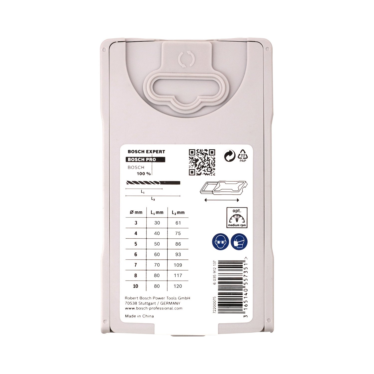 Diâmetros das brocas: 3 mm, 4 mm, 5 mm, 6 mm, 7 mm, 8 mm, 10 mm