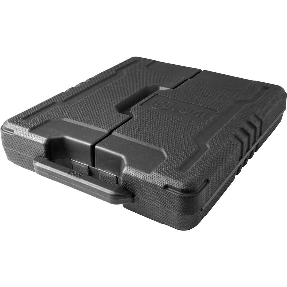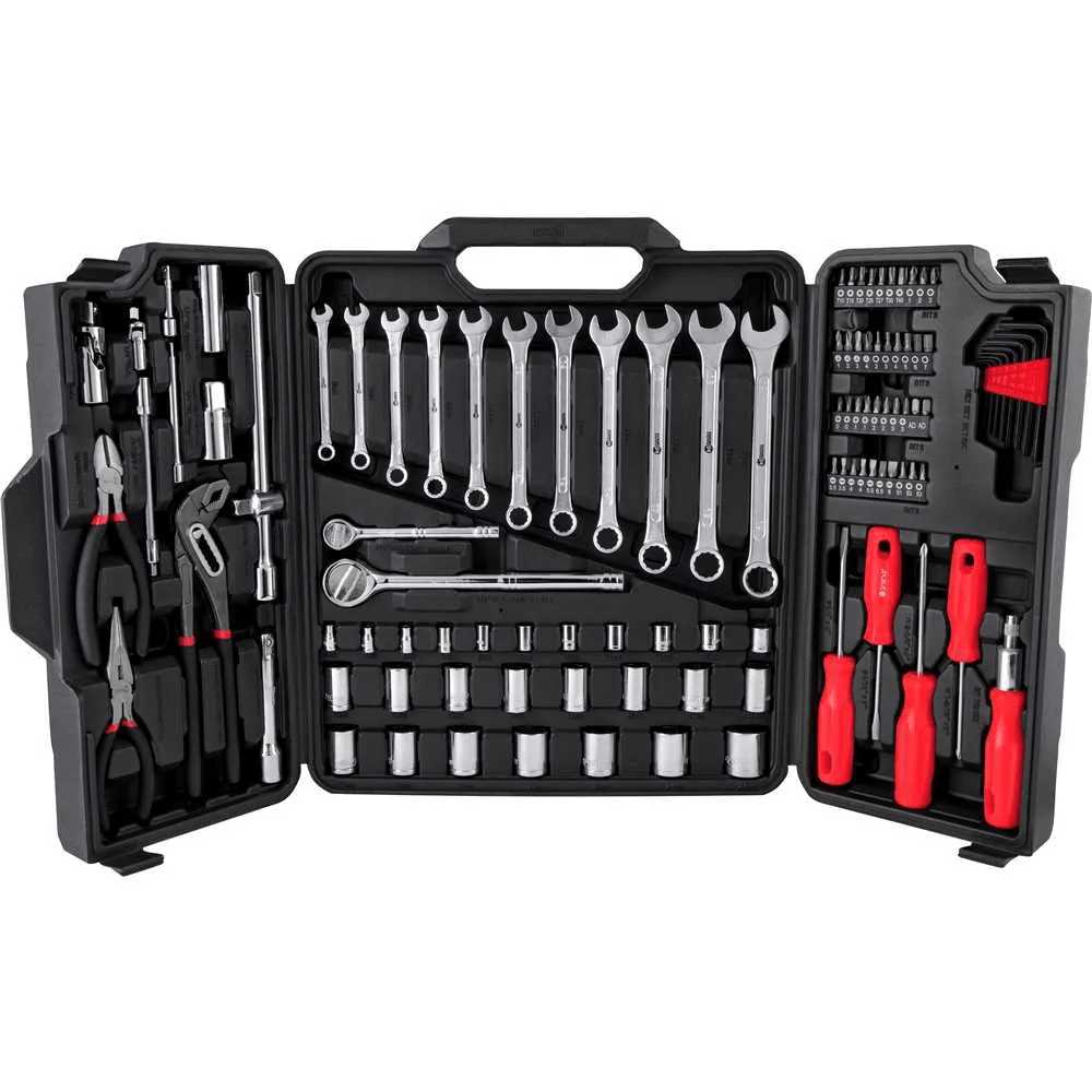 1 maleta plástica com 110 peças, incluindo alicates, martelo, chaves de fenda, phillips, combinadas, allen, soquetes de diferentes tamanhos, catracas, extensões, adaptadores e conjunto de bits variados.