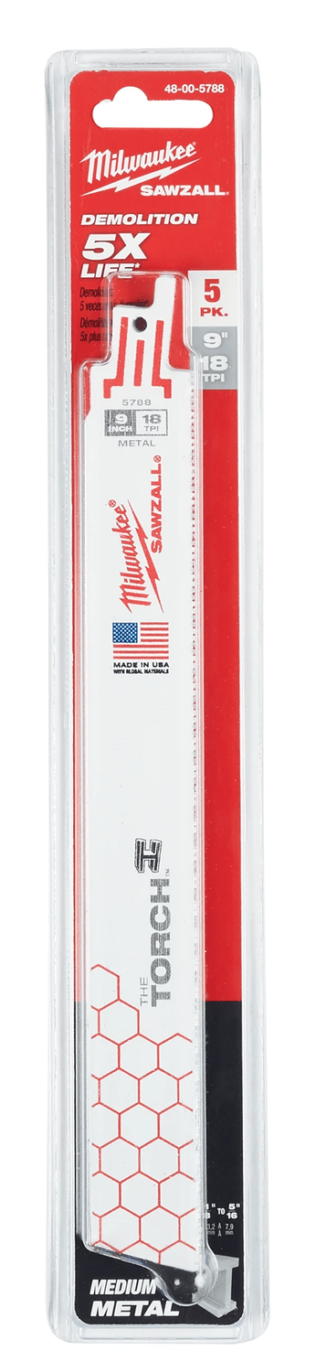 A Lâmina Serra Sabre 9" 18D Metal Torch 5 peças 48-00-5788 Milwaukee, oferece longa vida útil graças à tecnologia Double Duty Upgrade, que otimiza o formato dos dentes para resistir a desgastes. O recurso Tough Neck reforça a espiga, prevenindo quebras, tornando-a a mais resistente entre as lâminas SAWZALL.