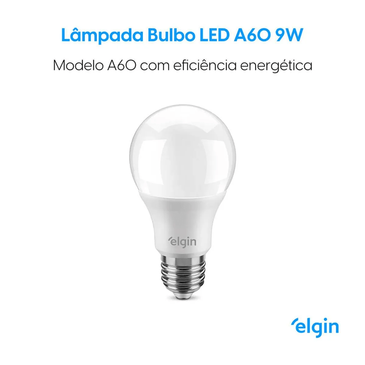 A Lâmpada LED Tipo A60 da Elgin possui potência de 9 watts e tensão bivolt (100-240V). Oferece um fluxo luminoso de 810 lumens, com eficiência de 90 lm/W.