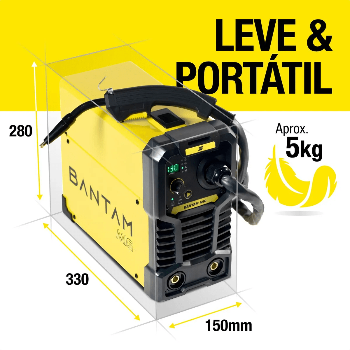 Com design compacto, alça de transporte e apenas 5,3 kg, a Máquina de Solda Inversora BANTAM MIG 130 127/220V ESAB é prática para levar a qualquer lugar, mantendo a robustez e a confiabilidade que só a ESAB entrega.
