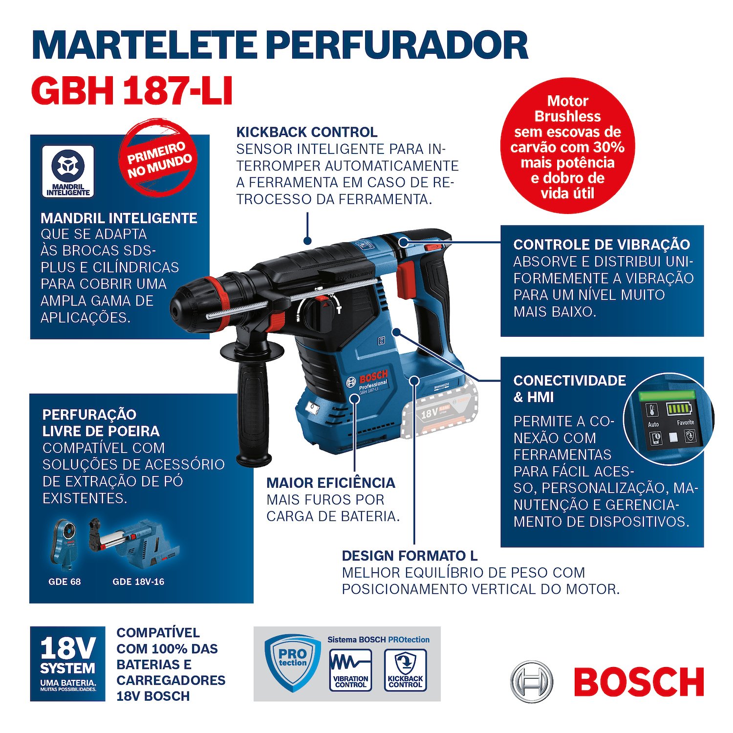 O Martelete Rompedor à Bateria Bosch GBH 187-LI Brushless 18V é a escolha ideal para profissionais que buscam potência, eficiência e mobilidade em suas tarefas de perfuração e demolição. Equipado com motor Brushless, oferece maior autonomia e o dobro de vida útil em comparação aos motores com escovas de carvão.