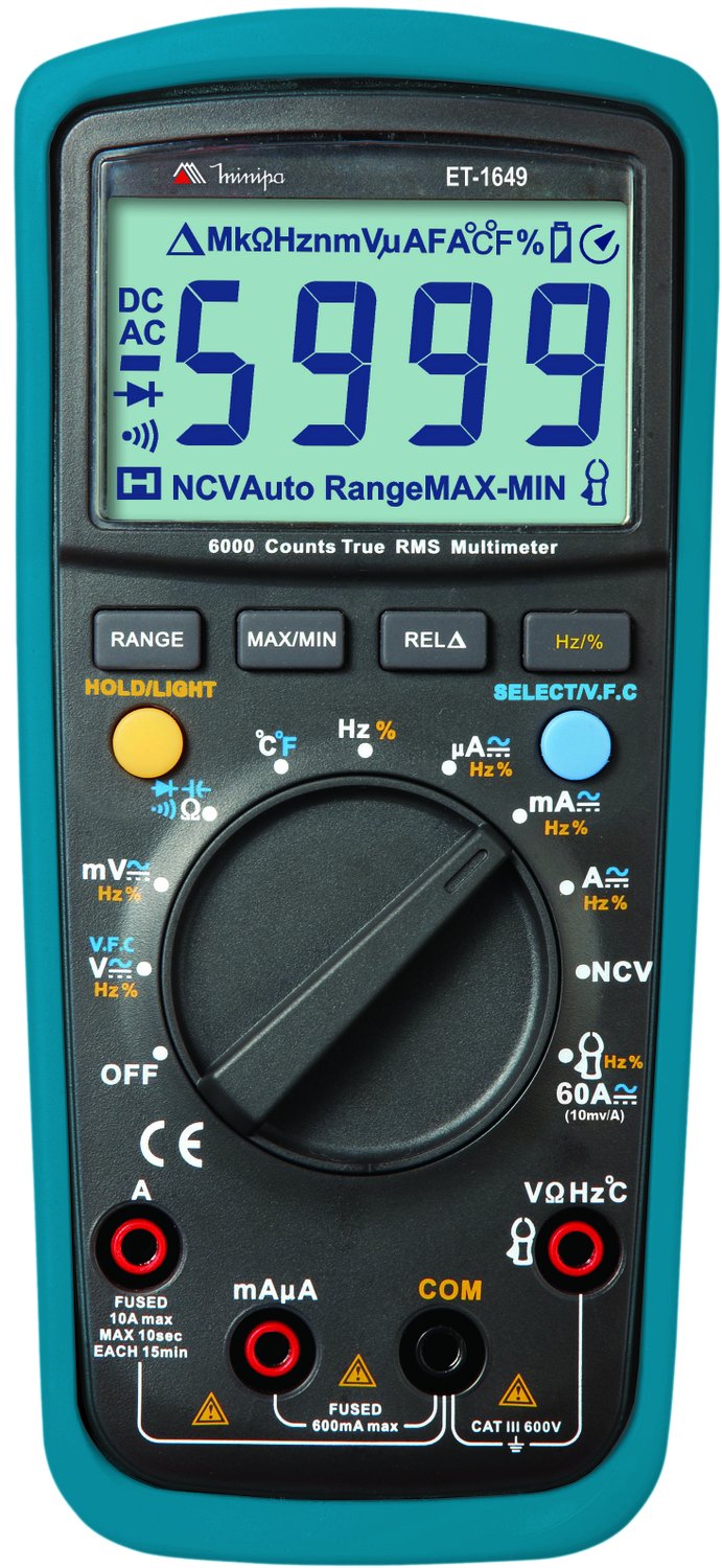 O Multímetro Digital ET-1649 Minipa é um instrumento ideal para eletricistas, técnicos e estudantes que necessitam de um instrumento confiável para medições elétricas e eletrônicas. Possui tecnologia True-RMS, que garante leituras mais exatas em sinais senoidais e não senoidais.