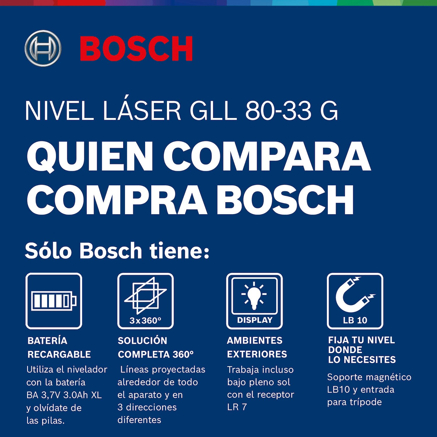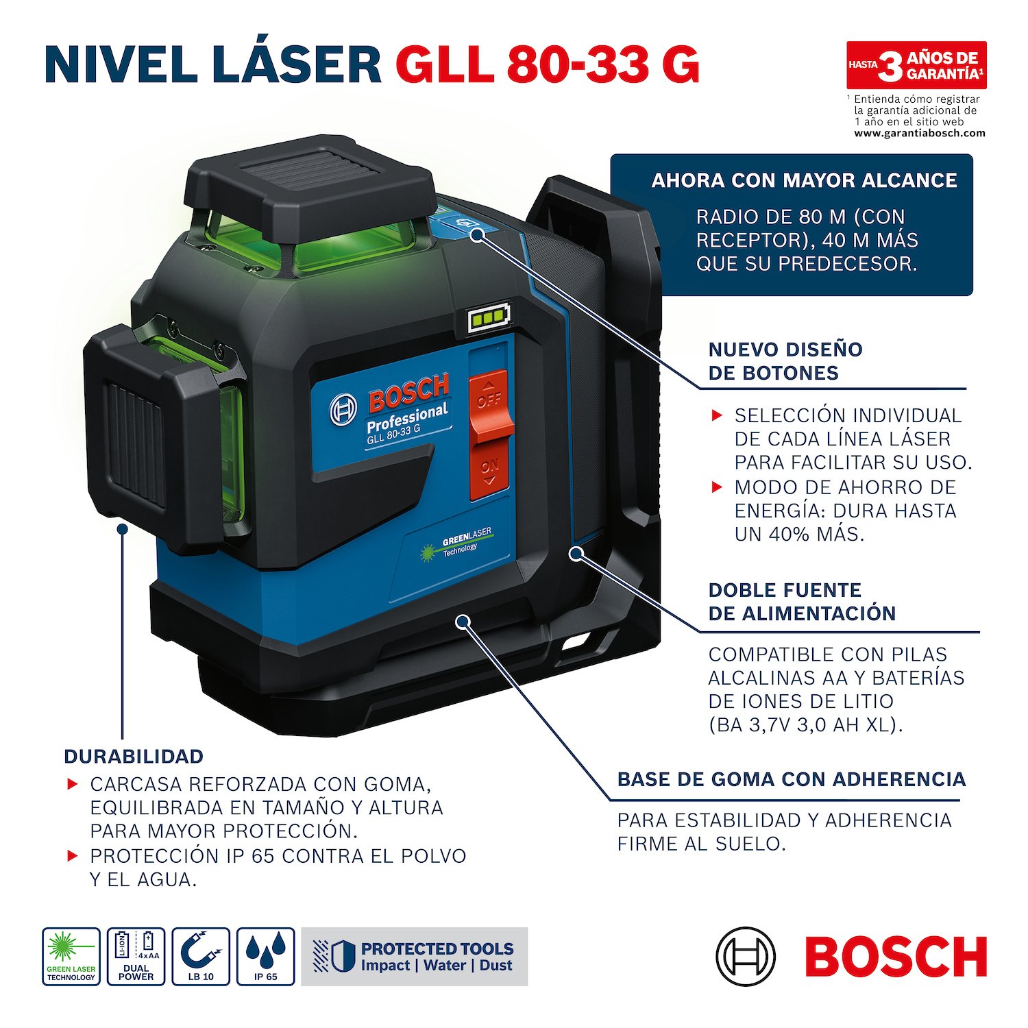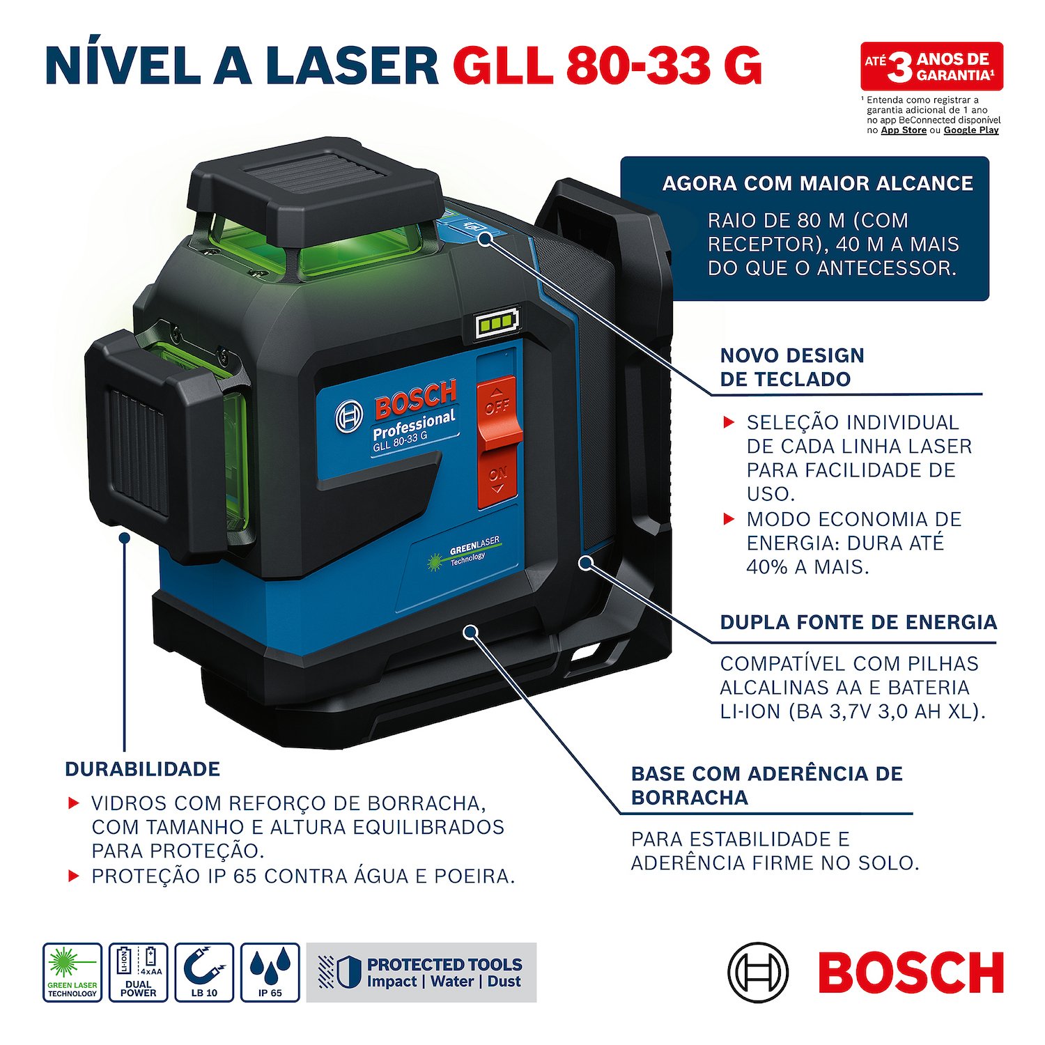 As 3 linhas de 360° permitem nivelamento horizontal e vertical simultâneo, agilizando processos e economizando esforço. Além disso, o Nível a Laser 30 metros 3 linhas a Pilha GLL 80-33 G Bosch pode ser combinado com receptor laser (opcional) para ampliar o alcance até 80 m, garantindo resultados impecáveis em grandes áreas.