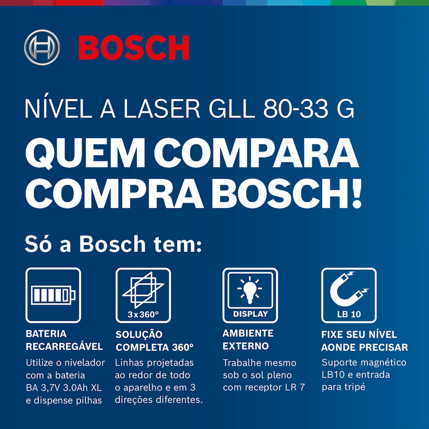 O Nível a Laser 30 metros 3 linhas a Pilha GLL 80-33 G Bosch é a solução perfeita para quem busca alinhamento rápido, confiável e extremamente preciso no dia a dia de obra ou reforma. Com linhas verdes de alta visibilidade — até quatro vezes mais nítidas do que o laser vermelho — o Nível a Laser 30 metros 3 linhas a Pilha GLL 80-33 G Bosch facilita instalações de drywall, tetos, molduras, pisos e muito mais, deixando o trabalho profissional e sem margem para erro.