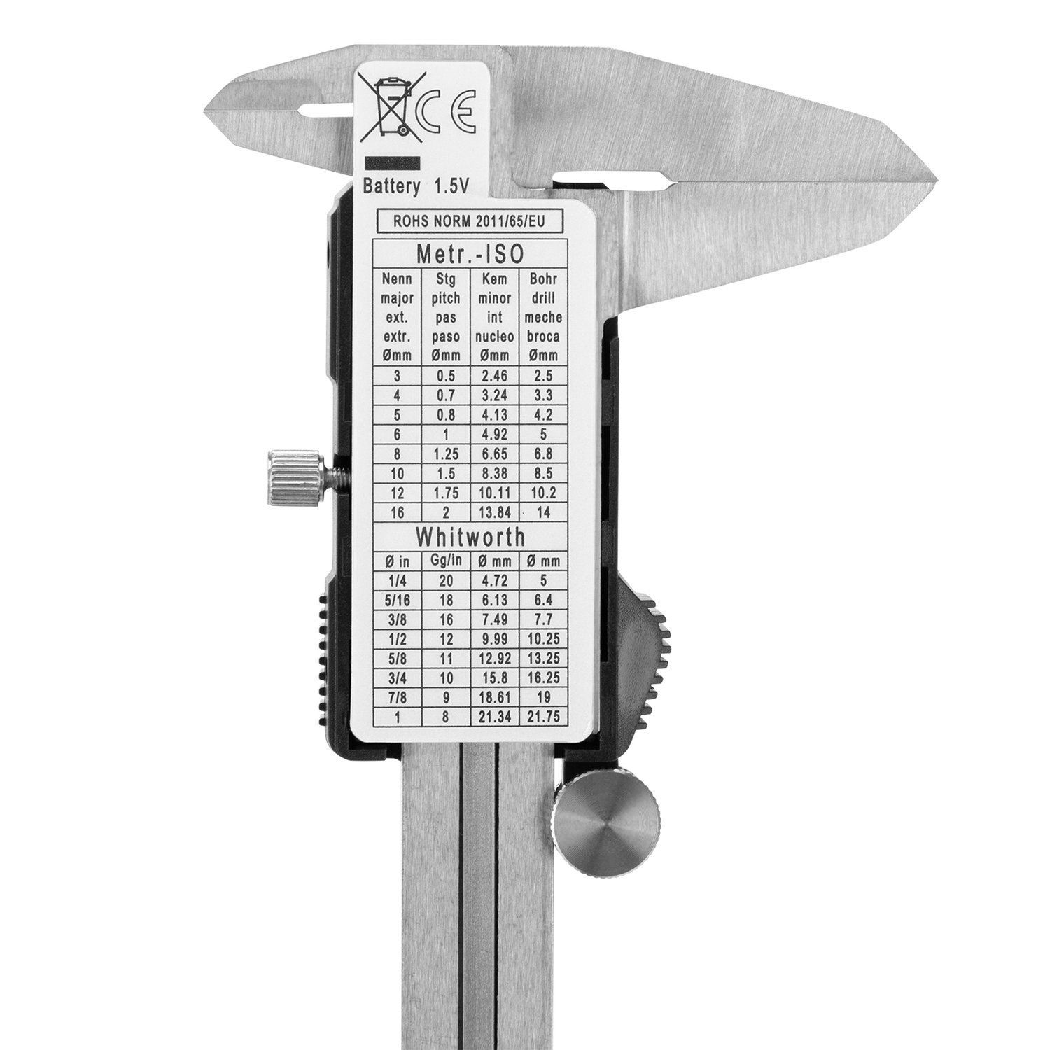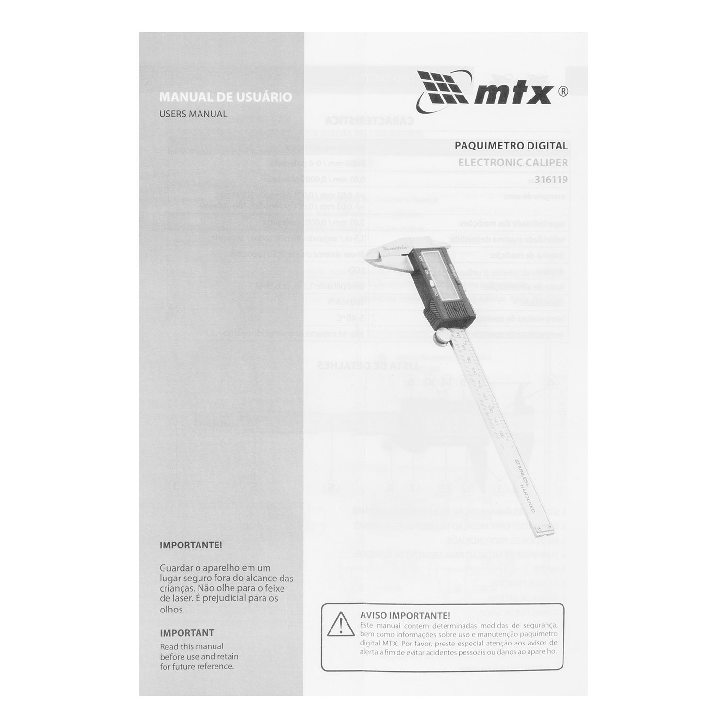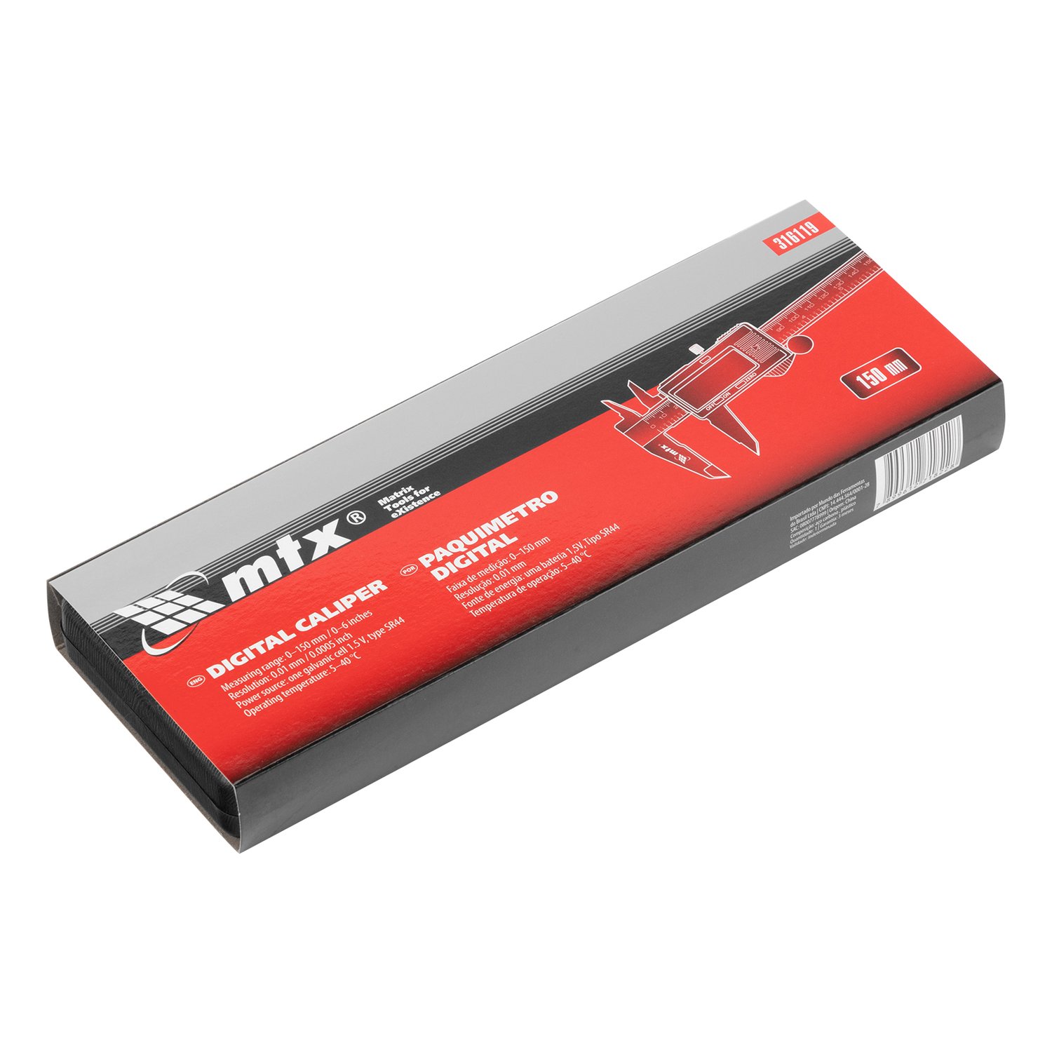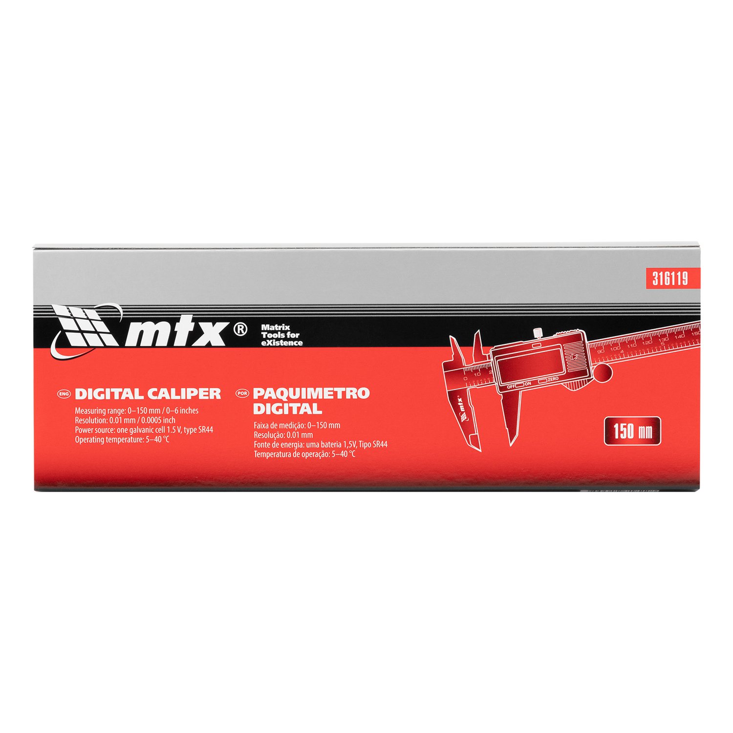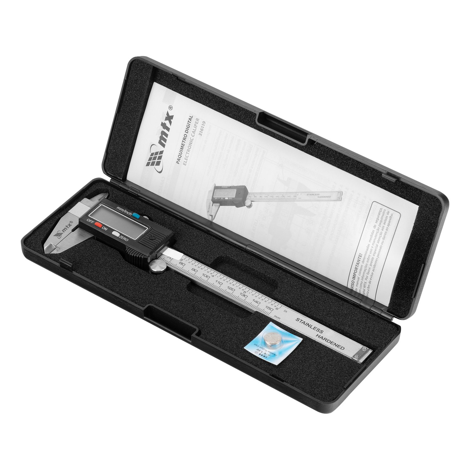 O Paquímetro Digital MTX 316119 oferece medições precisas de até 150 mm, sendo ideal para conferir dimensões internas, externas e profundidade. Fabricado em aço inoxidável, é resistente, durável e possui display digital de fácil leitura. Conta com medidor de profundidade, bateria SR44 de fácil reposição e estojo plástico para transporte seguro. Perfeito para oficinas, marcenarias e projetos caseiros.