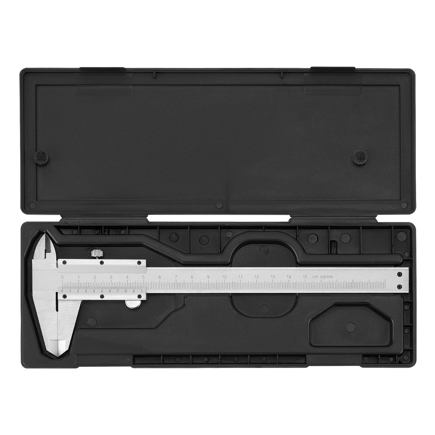 Seu nônio de leitura fina e o parafuso de fixação oferecem estabilidade durante a medição, enquanto o estojo plástico protege o instrumento no transporte e armazenamento.
