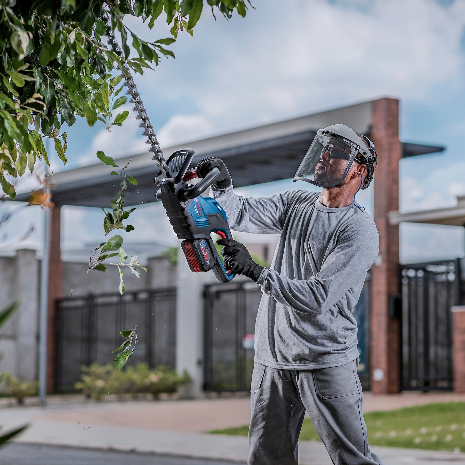Ideal para profissionais como jardineiros, paisagistas e equipes de facilities, o Podador Bosch GHE 18V-60 é leve e eficiente para cortes limpos em sebes densas e cercas vivas.