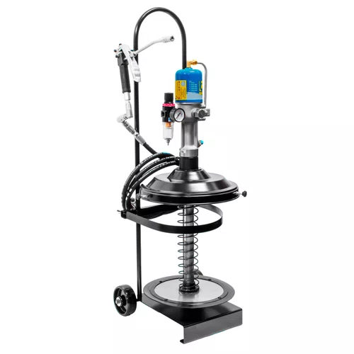 O sistema pneumático com relação de compressão 60:1 proporciona alta pressão de saída para distribuição eficiente do lubrificante, inclusive em pontos de difícil acesso. O equipamento é adaptável a baldes de graxa de 18 a 24 kg, possui carrinho para mobilidade e utiliza o Strike System, que melhora o aproveitamento da graxa e reduz desperdícios durante a aplicação.