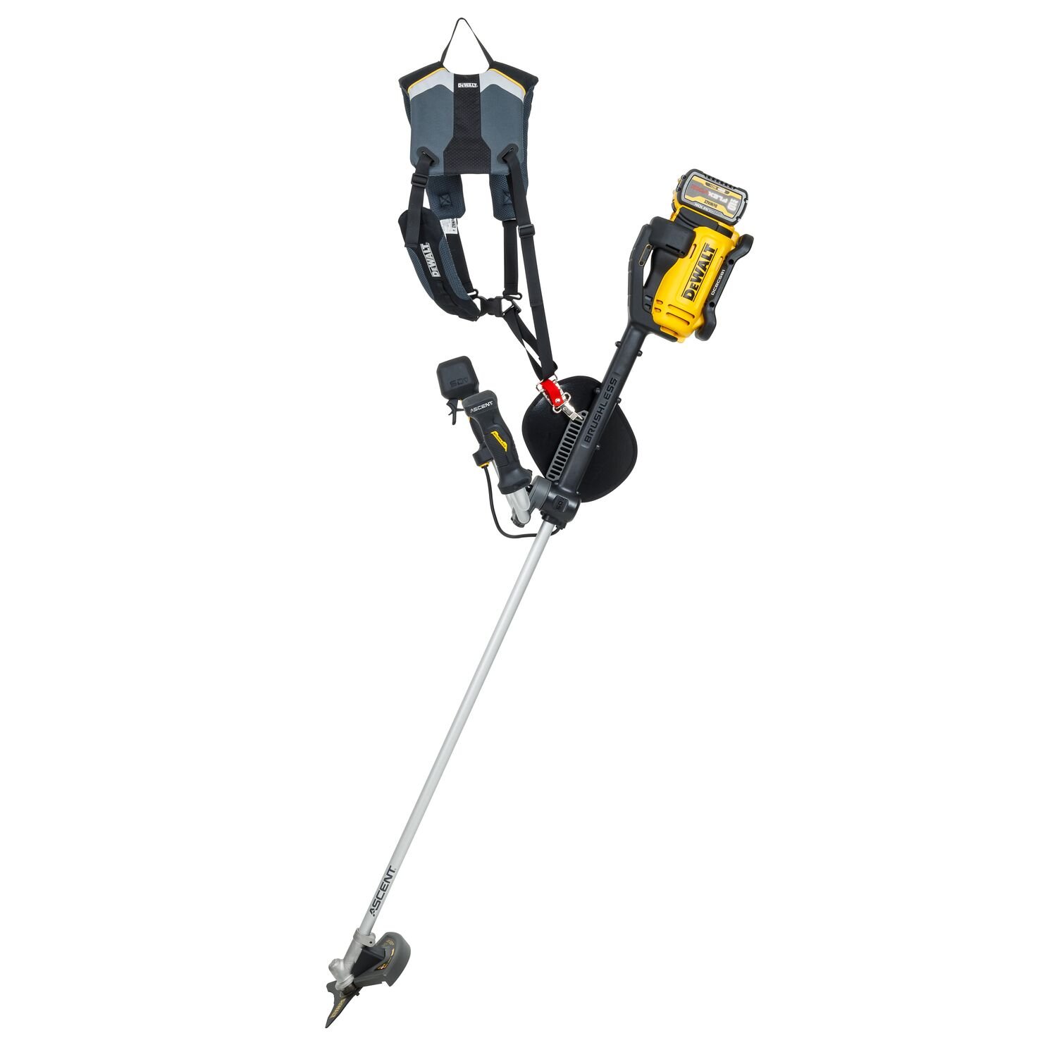 Seu design inclui guidão tipo bull handle com cinto de apoio ajustável, garantindo conforto e melhor distribuição de peso durante o uso prolongado. O painel com LED e gatilho de velocidade variável permite ajustar o corte conforme a necessidade, com 3 níveis de velocidade para otimizar desempenho e autonomia. A DCSB981B vem equipada com fio de nylon e lâmina tri-blade, possibilitando tanto o uso como aparador quanto como roçadeira mais robusta.