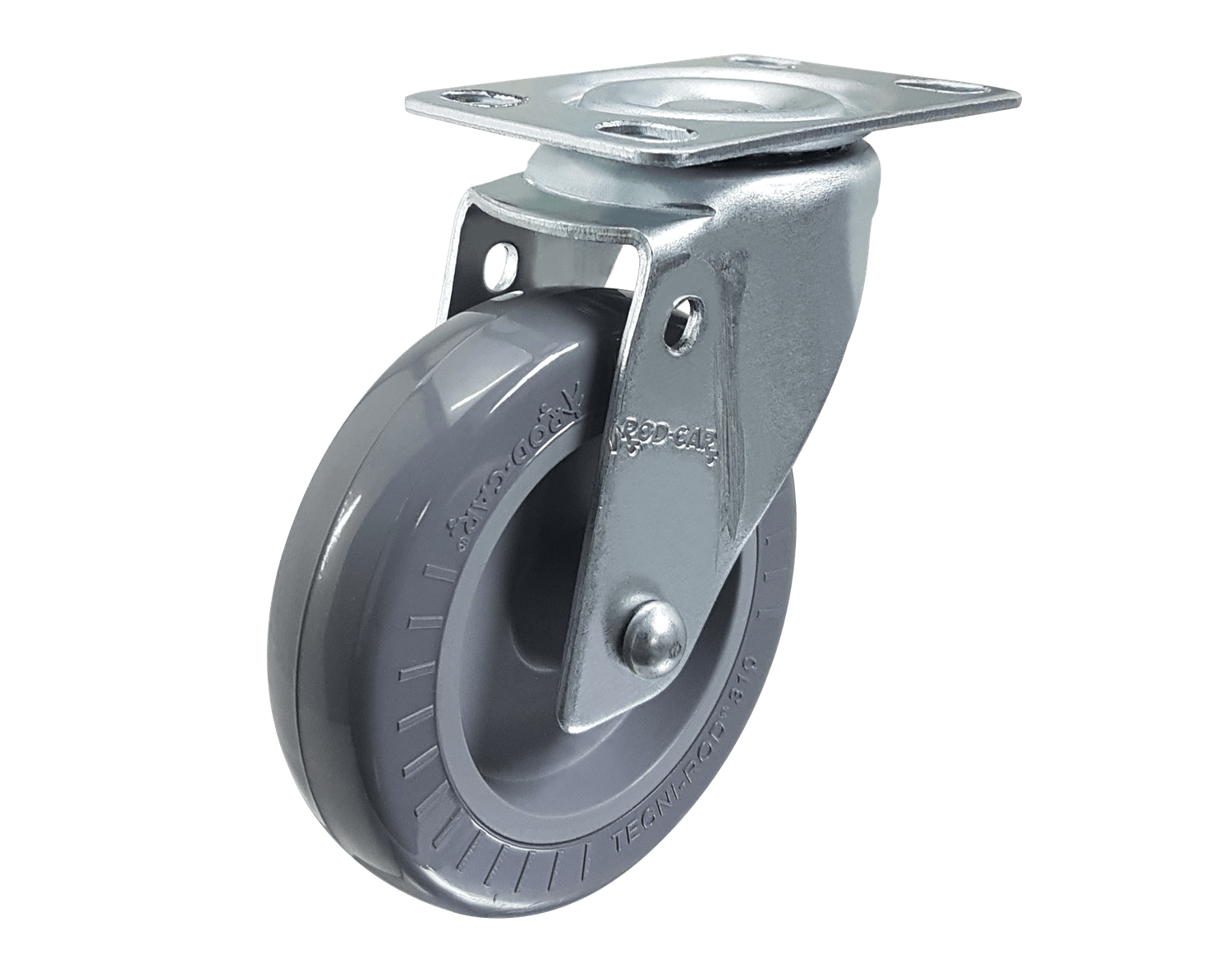 A roda possui revestimento de borracha moldada, núcleo em polipropileno injetado e mancal com furo passante. Desenvolvida para suportar cargas moderadas, oferece deslocamento silencioso, sem marcar ou danificar o piso. Destaca-se pela resistência a impactos, óleo, graxa e umidade.