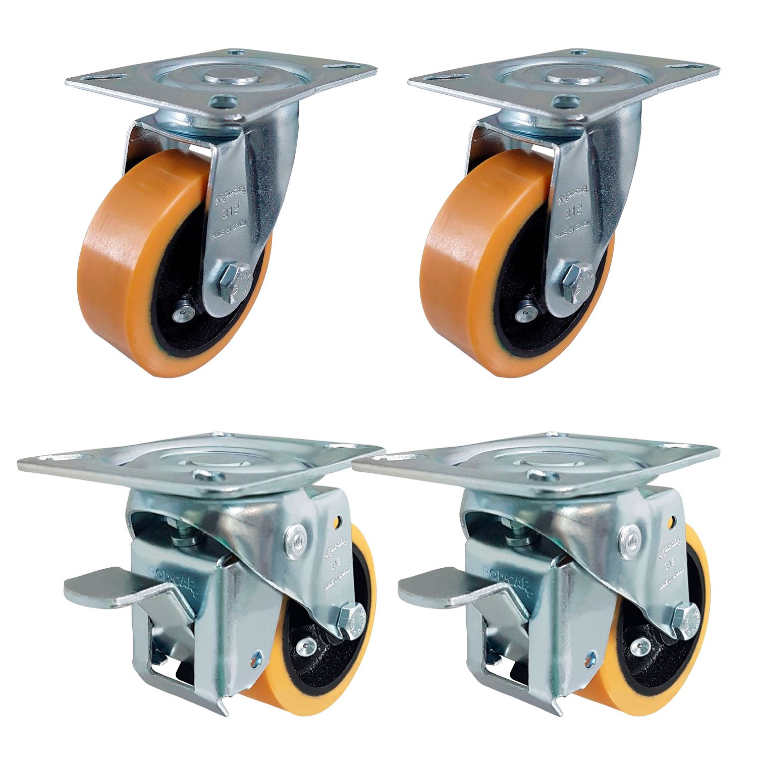 A roda é feita de poliuretano moldado, com núcleo em ferro fundido e mancal com bucha de nylon, garantindo resistência a óleos, graxas, solventes, sais e produtos químicos.