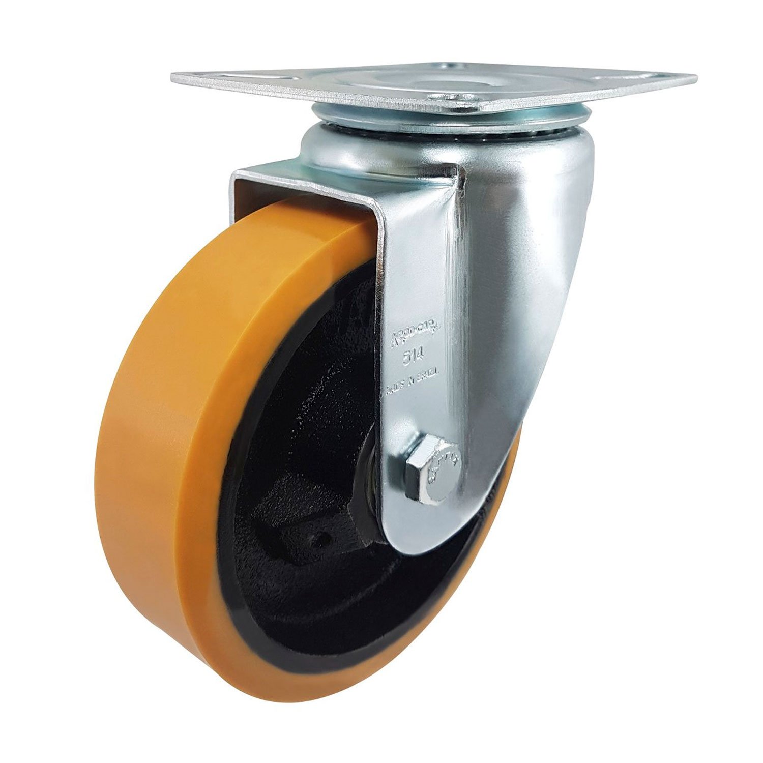 A roda é fabricada com revestimento de poliuretano moldado, núcleo em ferro fundido e mancal com rolamento esférico. Além disso, a roda é resistente a óleos, graxas, solventes, sais e produtos químicos.